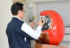 1月6日(月)仕事始めに際し社長より年頭のあいさつを賜り、恒例のだるまの目入れ式を行いました。